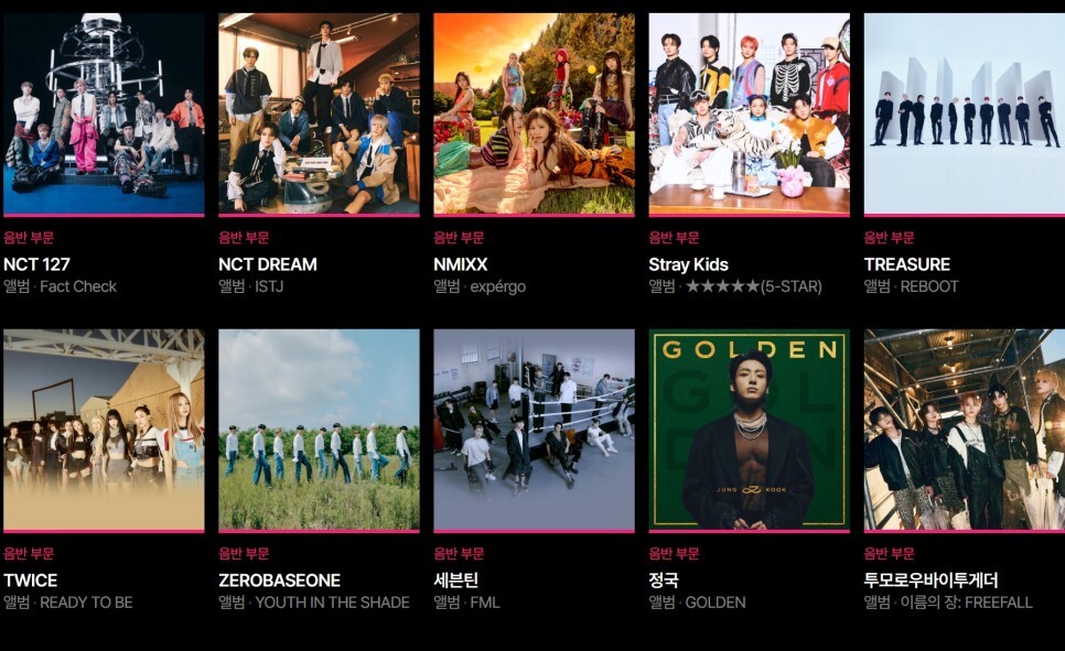 여자아이들, 에스파, 어거스트디, 에이티즈, 엔하이픈, 엑소, 있지, 아이브, 르세라핌, nct127, nct dream, 엔믹스, 스트레이키즈, 트레저, 트와이스, 제로베이스원, 세븐틴, 정국, 투모로우바이투게더.
