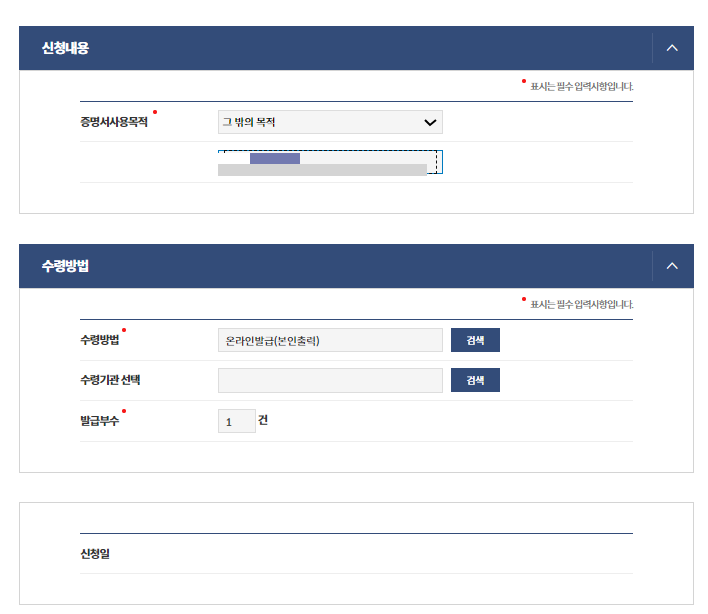 증명서 사용목적과 수령방법을 선택합니다. 사용목적은 발급 목적을 구체적으로 선택해야 합니다.