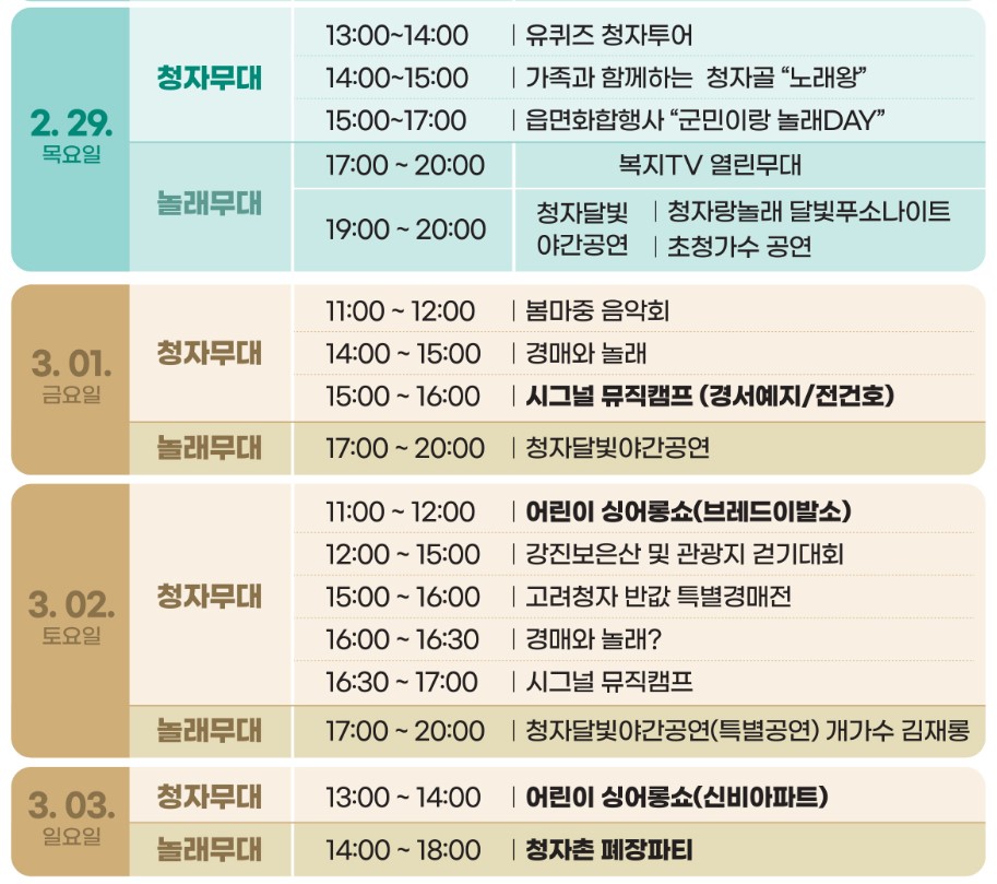 ● 2월 25일 : 화목가마요출, 시그널뮤직캠프, 강진문화예술 공연 등