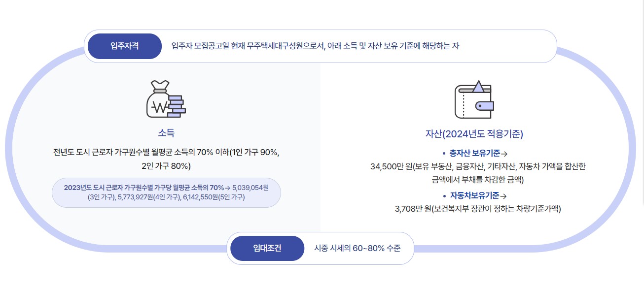 월평균 소득은 3,102,785원 이하이어야 하며, 총자산은 36,100만원 이하