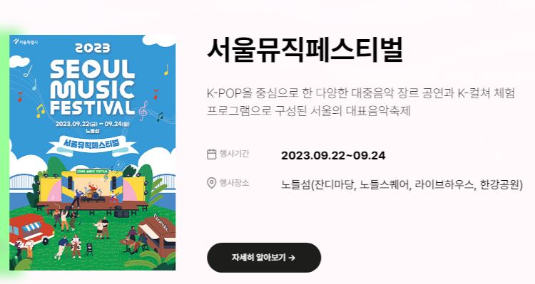 내용 : K-POP을 중심으로 한 다양한 대중음악 장르 공연과 K-컬쳐 체험 프로그램으로 구성된 서울의 대표음악축제