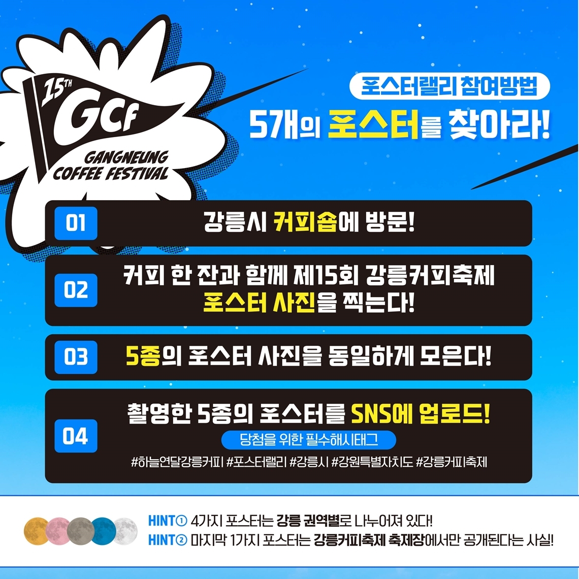 축제장 내에 배치된 5개의 포스터를 찾아 사진을 찍고, 필수 해시태그와 함께 자신의 소셜 미디어에 업로드합니다.