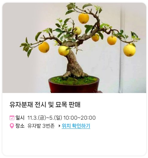 유자 분재 전시 및 묘목 판매: 유자의 분재와 묘목을 관람하고 구매할 수 있는 기회를 제공합니다.